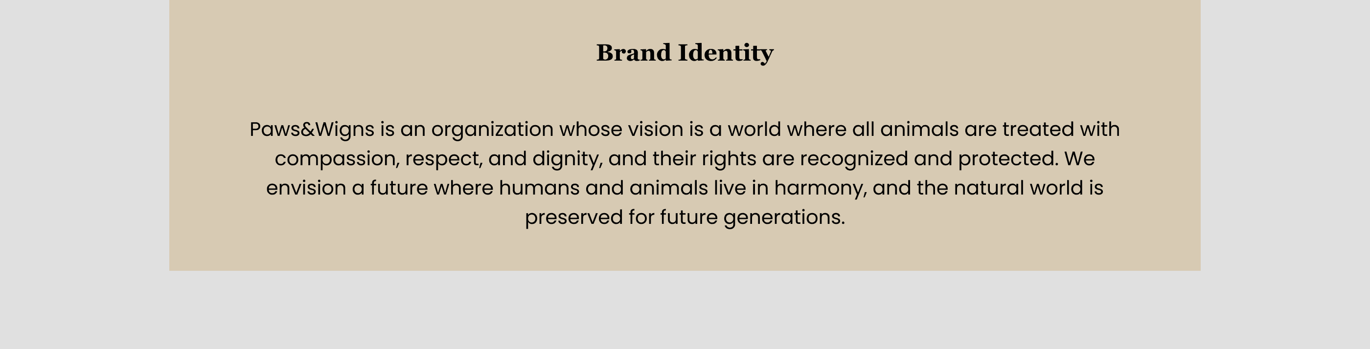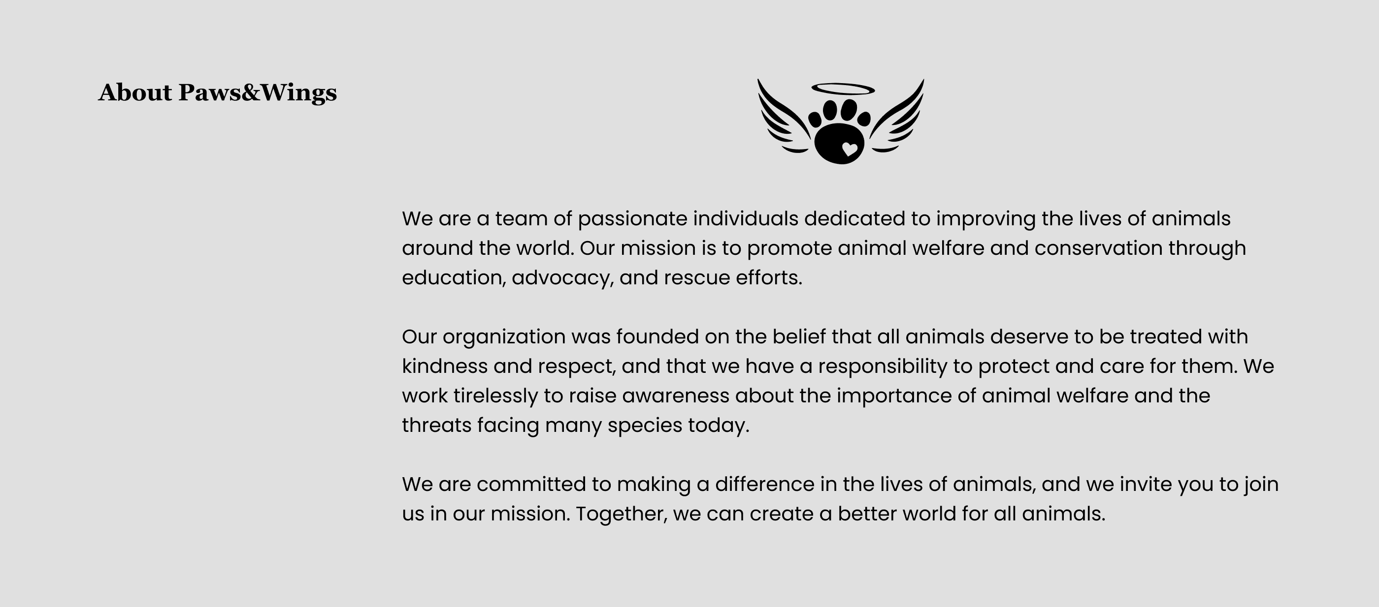 Paws&Wings' vision is a world where all animals are treated with compassion, respect, and dignity, and their rights are recognized and protected. We envision a future where humans and animals live in harmony, and the natural world is preserved for future generations.